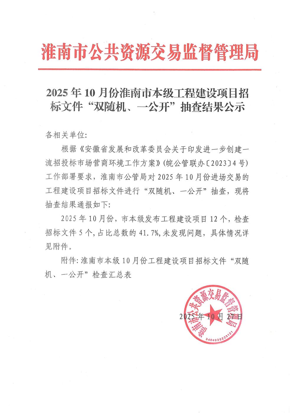 2025年10月份淮南市本级工程建设项目招标文件“双随机、一公开”抽查结果公示
