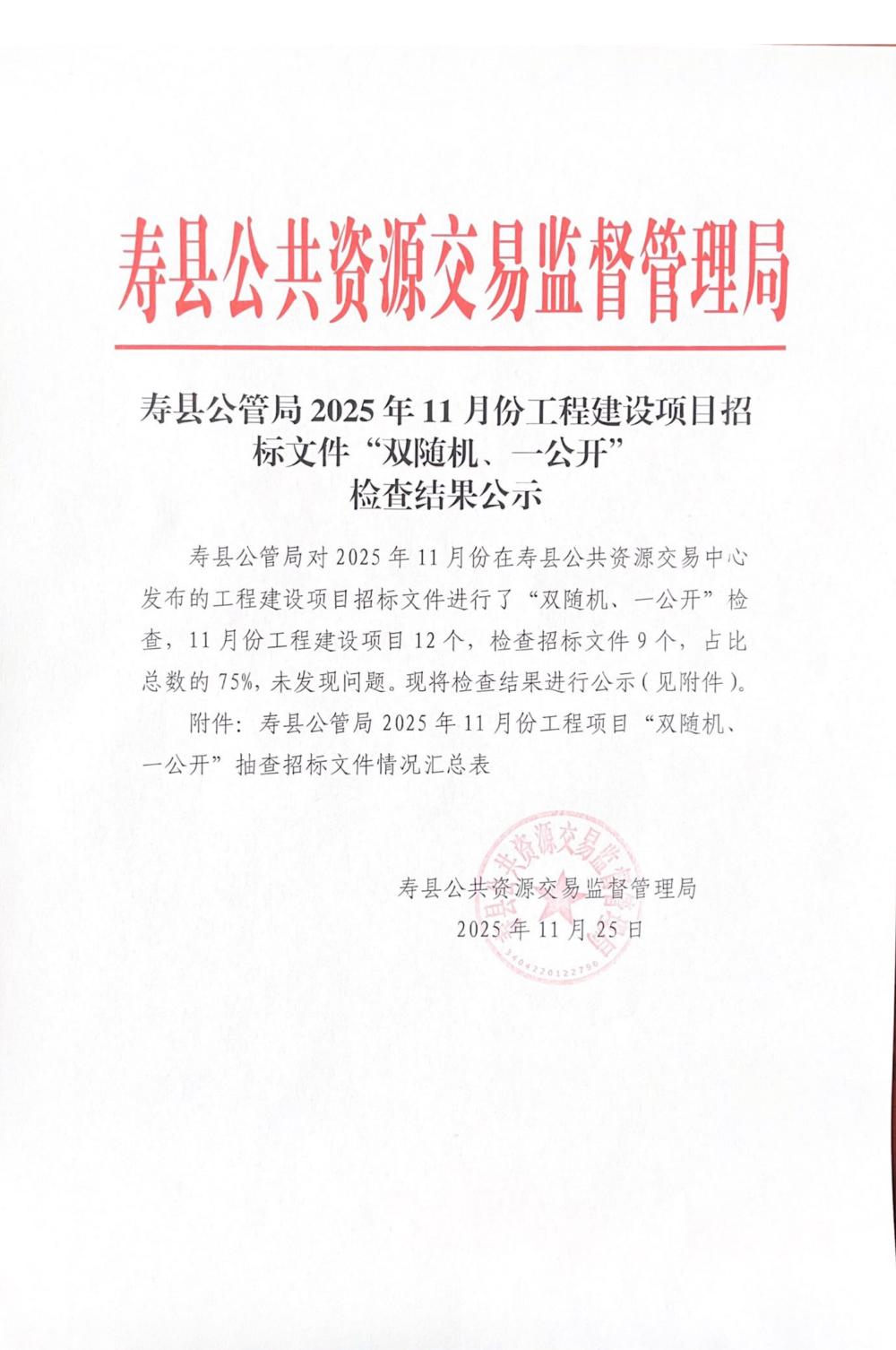 寿县公管局2025年11月份工程建设项目招标文件“双随机、一公开”检查结果公示