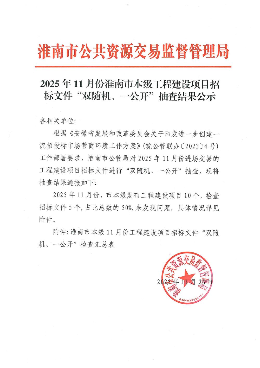 2025年11月份淮南市本级工程建设项目招标文件“双随机、一公开”抽查结果公示