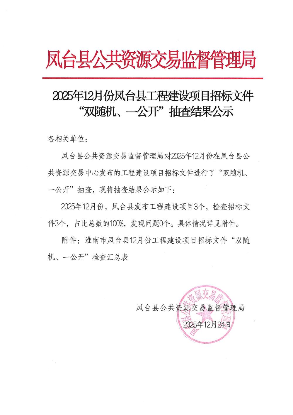 2025年12月份凤台县工程建设项目招标文件“双随机、一公开”抽查结果公示
