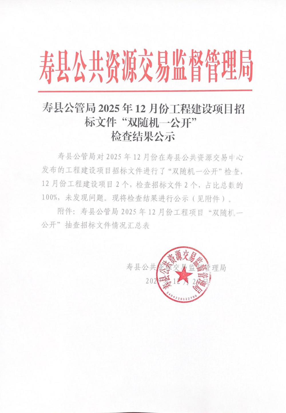 寿县公管局2025年12月份工程建设项目招标文件“双随机、一公开”检查结果公示