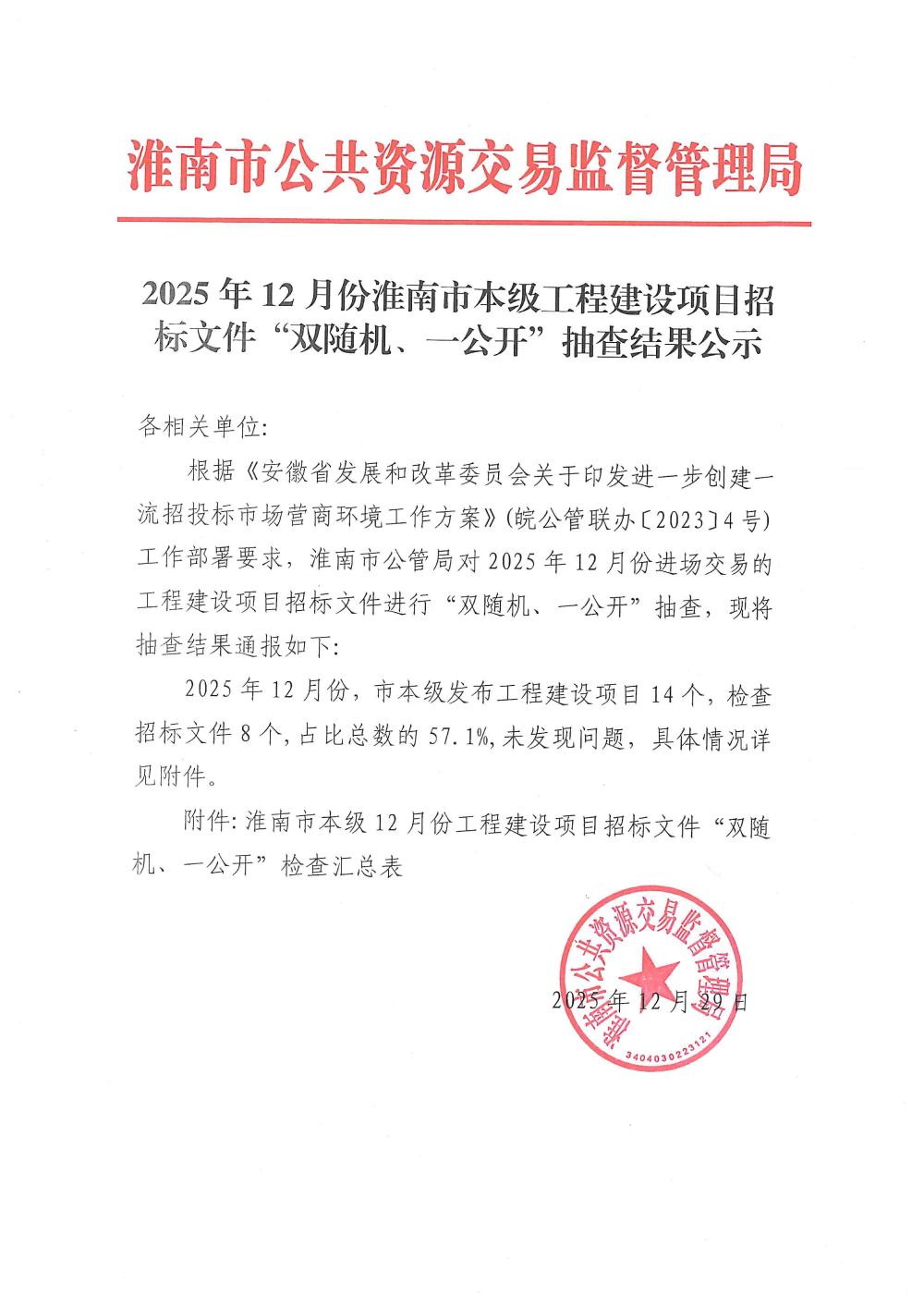 2025年12月份淮南市本级工程建设项目招标文件“双随机、一公开”抽查结果公示