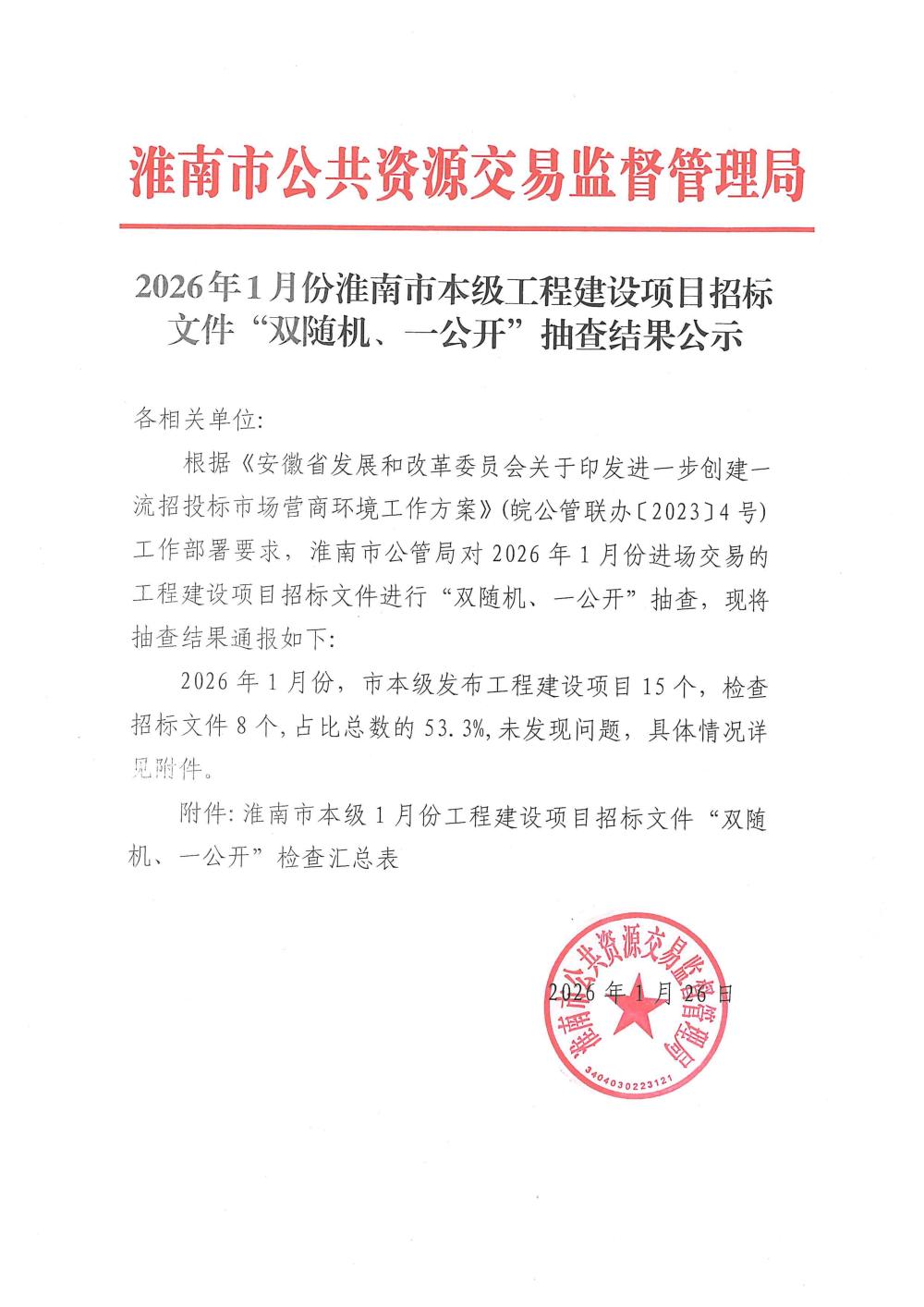 2026年1月份淮南市本级工程建设项目招标文件“双随机、一公开”抽查结果公示