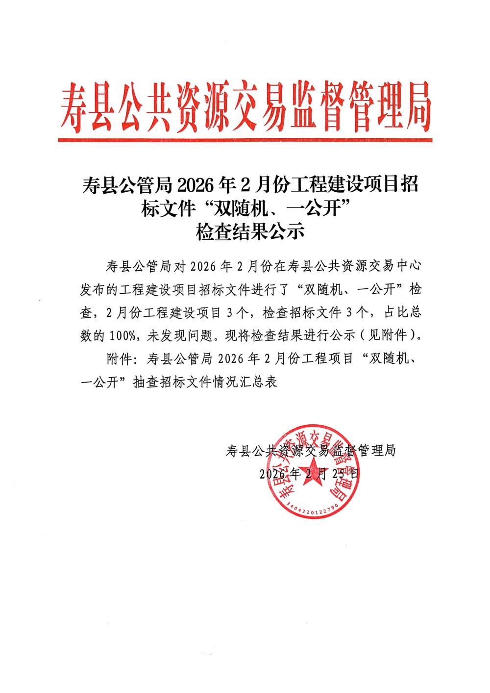 寿县公管局2026年2月份工程建设项目招标文件“双随机、一公开”检查结果公示