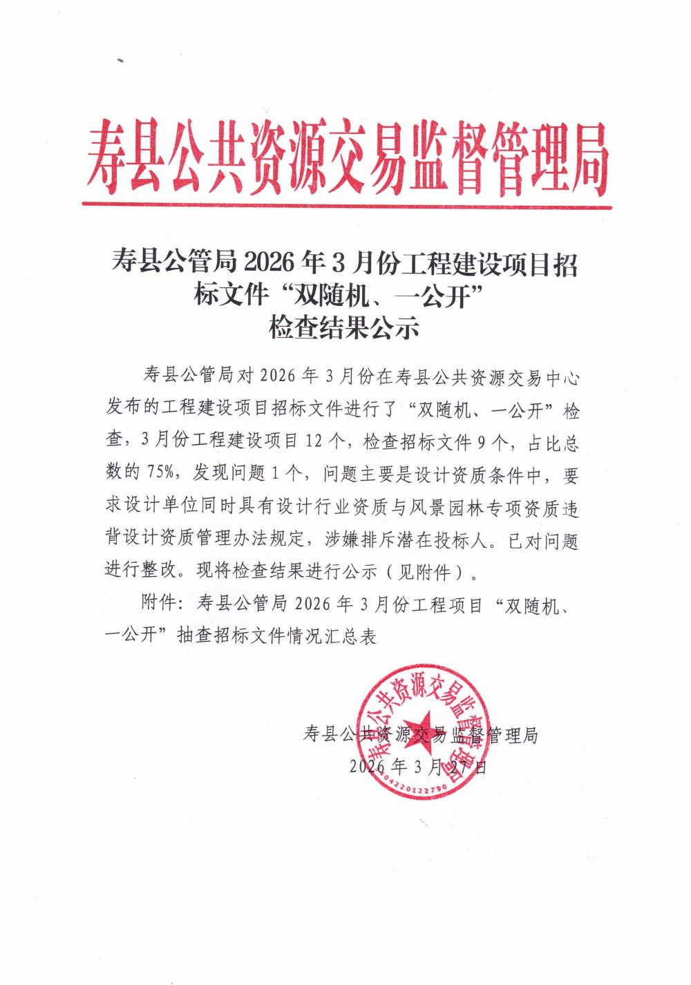 寿县公管局2026年3月份工程建设项目招标文件“双随机、一公开”检查结果公示