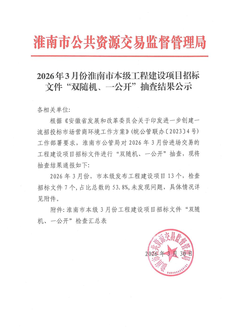 2026年3月份淮南市本级工程建设项目招标文件“双随机、一公开”抽查结果公示