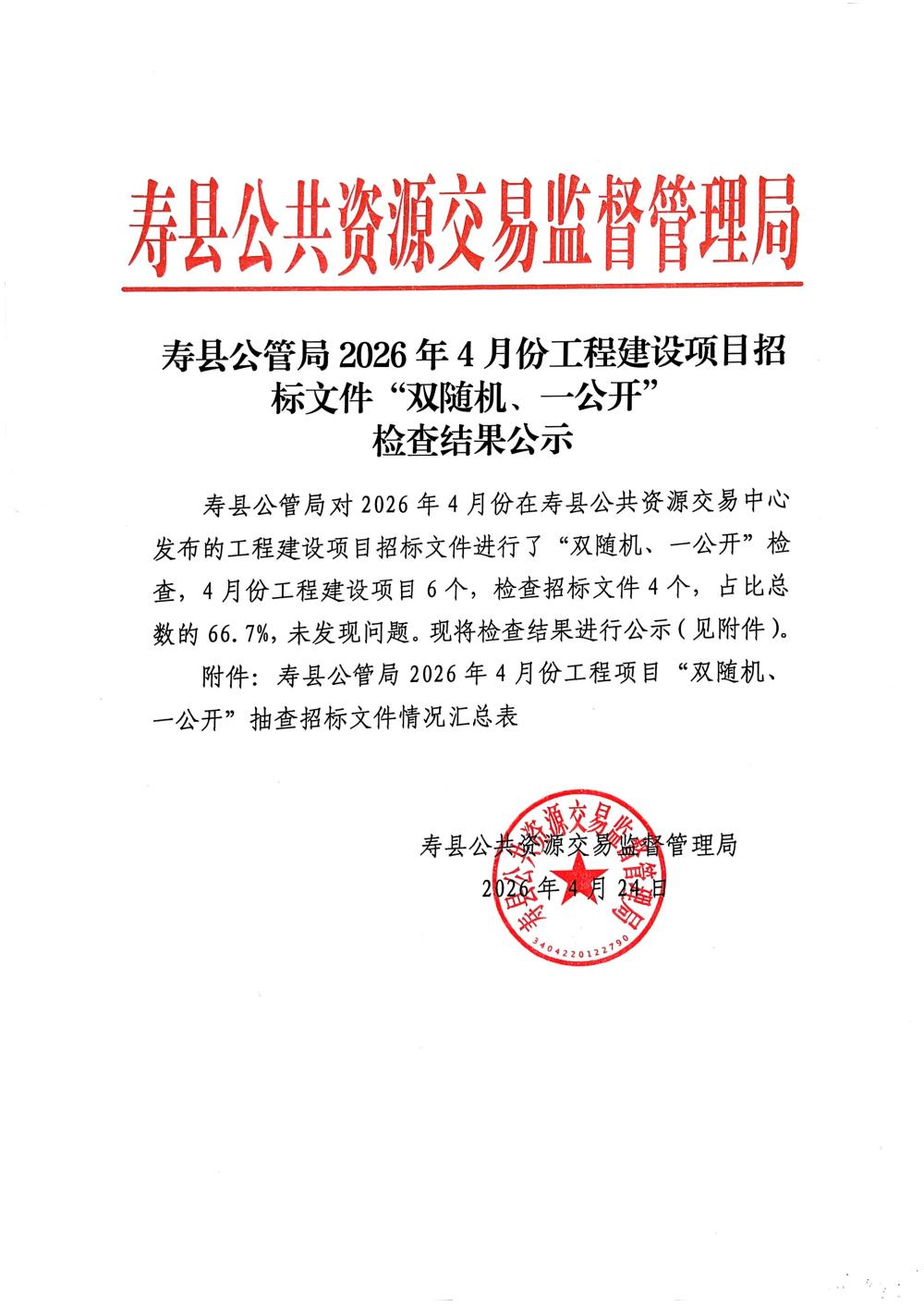 寿县公管局2026年4月份工程建设项目招标文件“双随机、一公开”检查结果公示