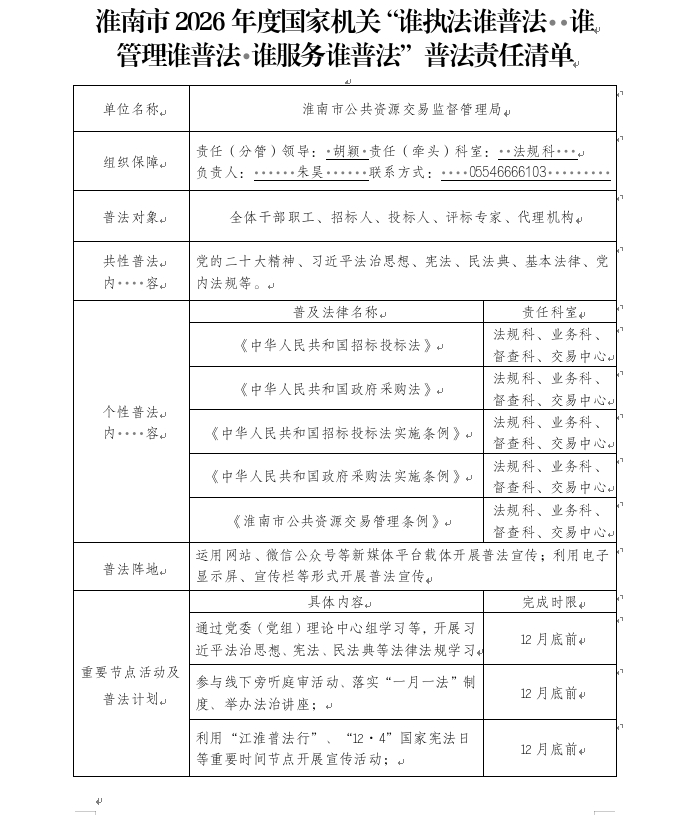 淮南市2026年度国家机关“谁执法谁普法·谁管理谁普法·谁服务谁普法”普法责任清单
